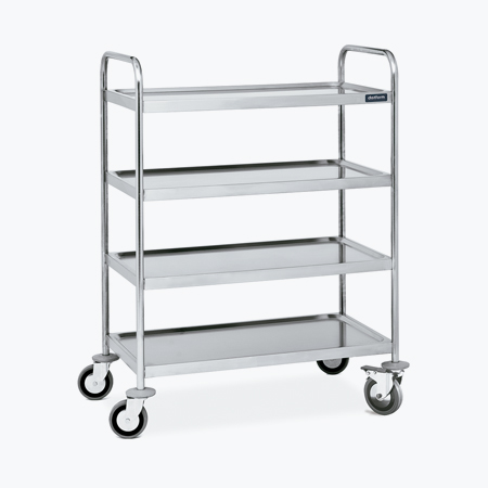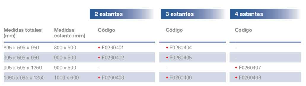 - Carga máxima repartida por estante de 75 kg, con una carga máxima total de 200 kg. 4 ruedas de Ø125 mm con parachoques, 2 de ellas con freno.