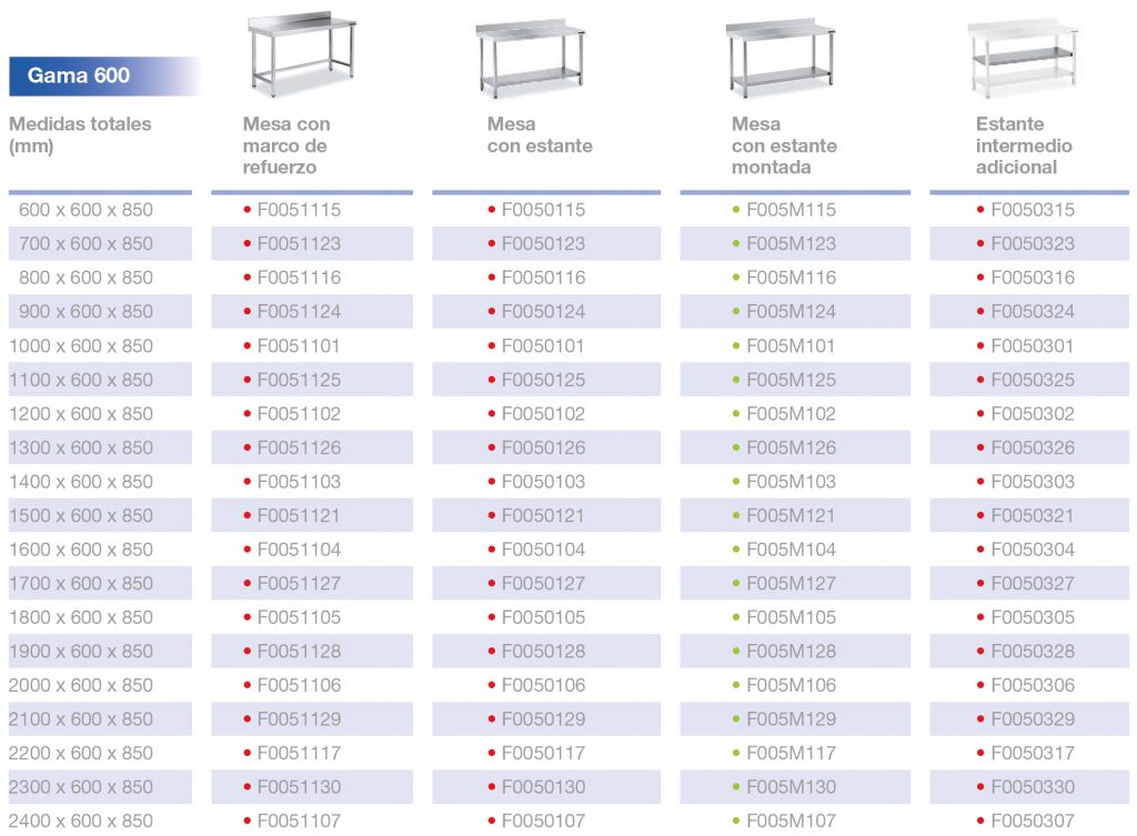 • Encimeras de acero inoxidable AISI 304 18/10 satinado con omegas de refuerzo.